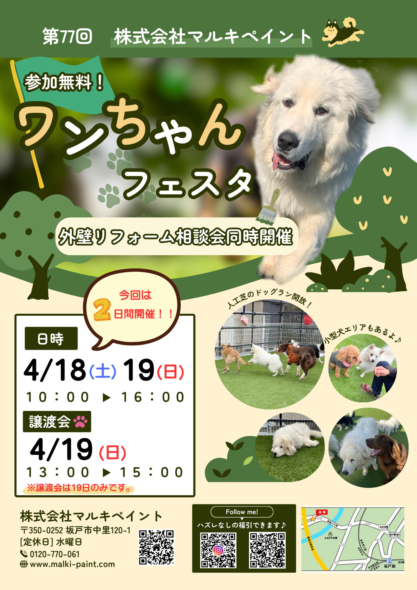第77回ワンちゃんフェスタを4/18(土)4/19(日)に行います。