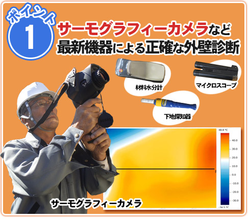 私たちも同様に、打診棒やマイクロスコープ、水分計、サーモグラフィーなどを使い、お家の診断を行い、最適な下塗り材や下地処理、また効果的な上塗り材を導き出します。