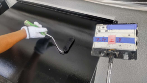 これで上塗りもしっかり塗装されます。屋根の上塗りに使用したのはサンフロンルーフです。 サンフロンルーフは紫外線や風雨、錆などの劣化因子から塗装面を強力にブロックします。また、藻やカビの発生を抑制し、清潔な住環境を維持します。