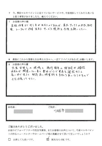 - 屋根作業まで行う事が出来るのであれば、屋外アンテナの取外し・取付等トータルで作業できるサービスの提供を今後お願いしたい。