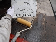 下塗り3回目として傷んだコロニアル屋根の再生に効果的なベスコロフィラーを塗り、さらに強化させます。