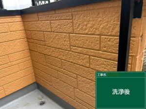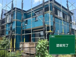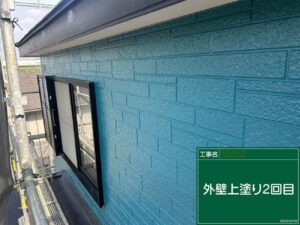 今回はスーパーセランフレックスという塗料を使用しました。雨や紫外線に強く、汚れが付きにくい高性能塗料です。柔軟性が高く、ひび割れの発生を抑える効果があります。塗料の性能を最大限に引き出すため、塗布量や乾燥時間を正確に管理しながら丁寧に仕上げていきます。