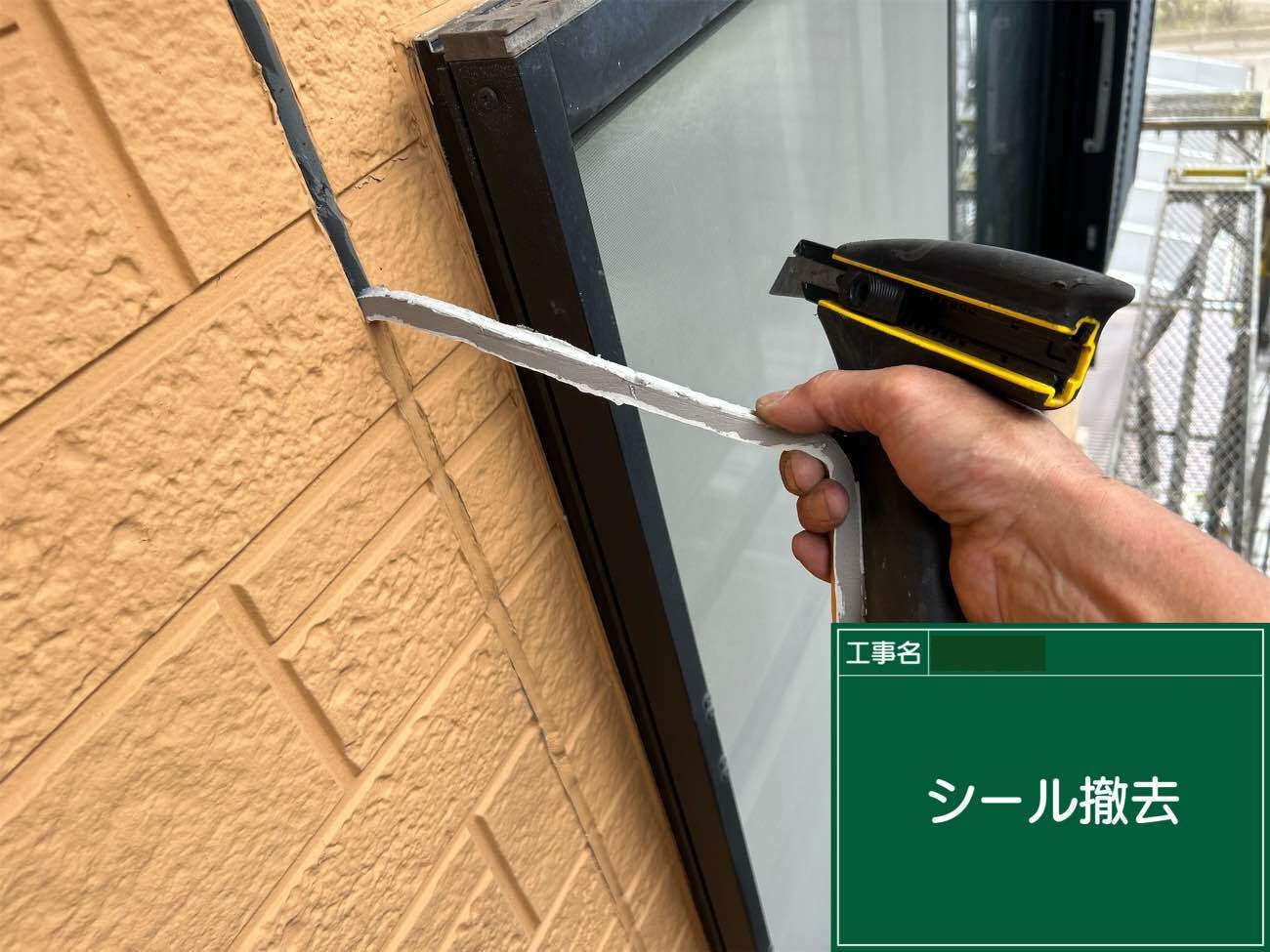 劣化した既存のシーリング材を撤去していきます。新しいシーリング材をしっかり密着させるためには、古いシールを完全に除去し、下地をきれいにすることが必要となります。