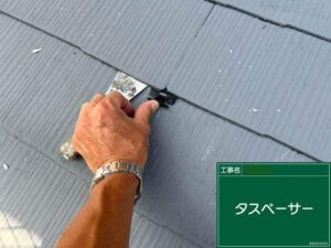 タスペーサーとは、屋根材の重なり部分に差し込む「縁切り部材」です。塗装を行うと、水を流す構造になっている重なり部分に塗料が入り込み、水の逃げ口(通気口)がふさがってしまうことがあります。これを防止するため、タスペーサーで通気・排水の隙間を確保します。