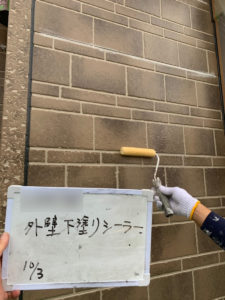 外壁塗装の下塗りをしていきます。1回目に使用するのはシーラーです。シーラーは既存塗膜と新たに塗る塗料との付着性を高めることを目的としています。また、上塗り塗料の吸い込みムラを止めて、塗装ムラを防ぐこともできるのです。