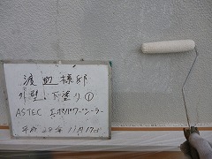 外壁塗装の下塗り1回目はエポパワーシーラーで上塗り塗料との密着を高めます。また、上塗り材が下地に吸い込まれるのを防止し、色ムラの発生を抑えます。