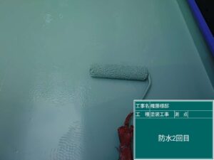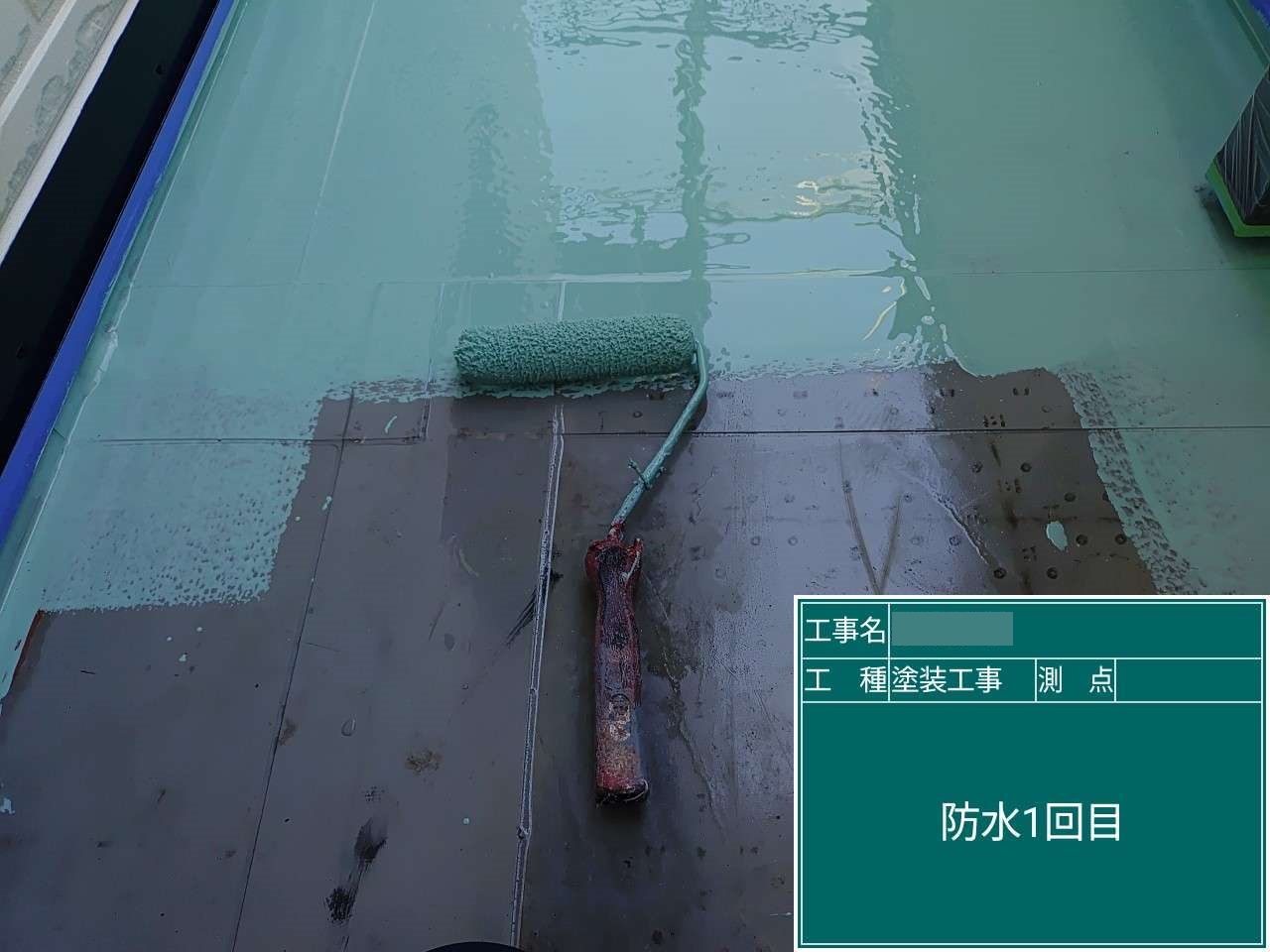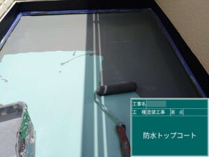 ベランダの防水工事です。接着剤となるプライマーを塗布し、防水材を2度塗りしていきます。1回目で防水膜を形成、2回目で耐久性・防水性を強化します。仕上げに紫外線・汚れ・摩耗から防水層を守る保護塗料としてトップコートを塗布します。
