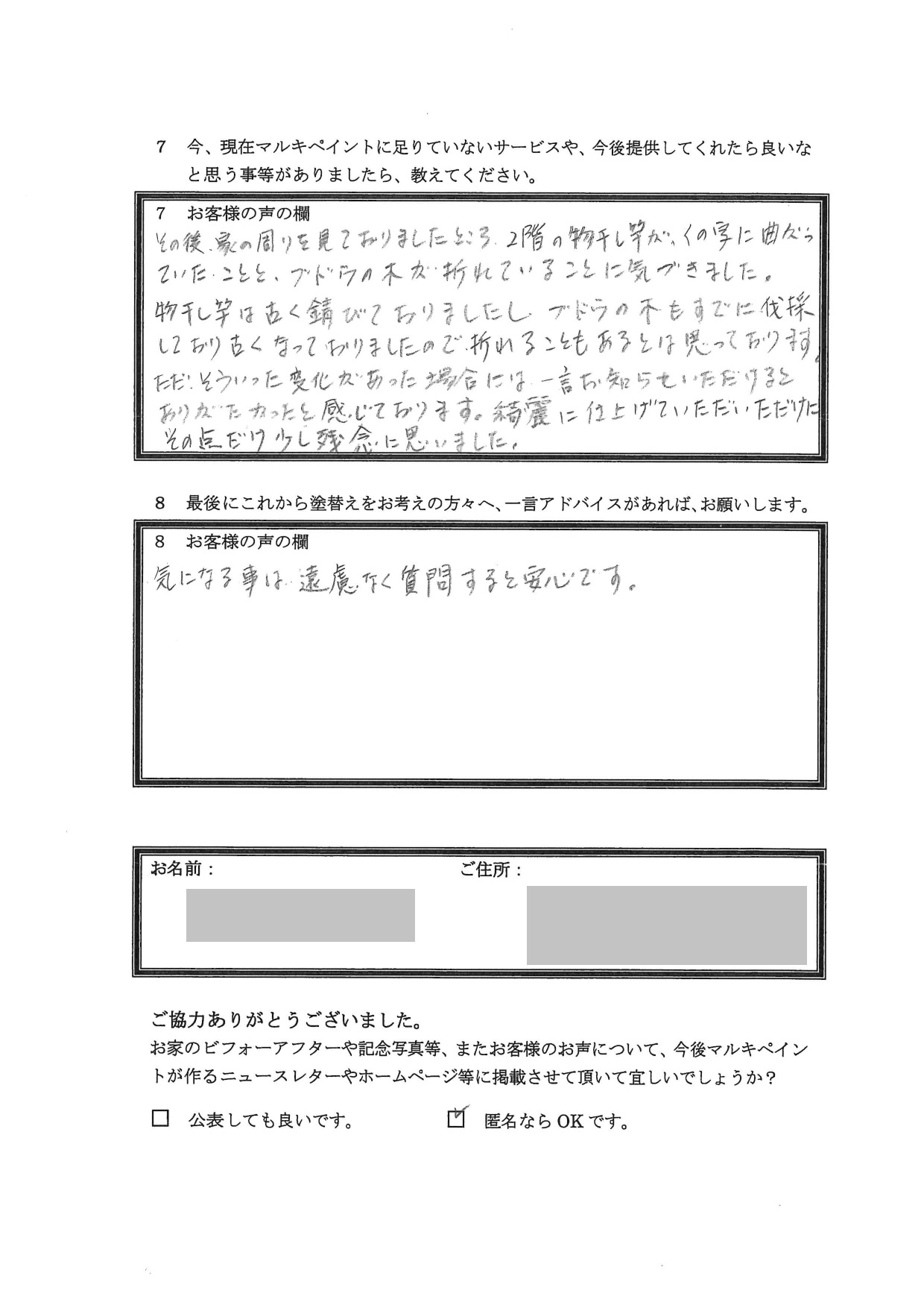 - その後、家の周りを見ておりましたところ、2階の物干し竿がくの字に曲がっていたことと、ブドウの木が折れていることに気づきました。物干し竿は古く錆びておりましたし、ブドウの木もすでに伐採しており古くなっておりましたので折れることもあるとは思っております。ただ、そういった変化があった場合には一言お知らせいただけるとありがたかったと感じております。綺麗に仕上げていただいただけにその点だけ少し残念に思いました。