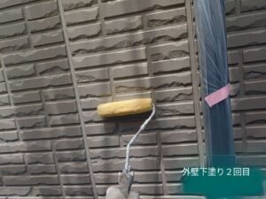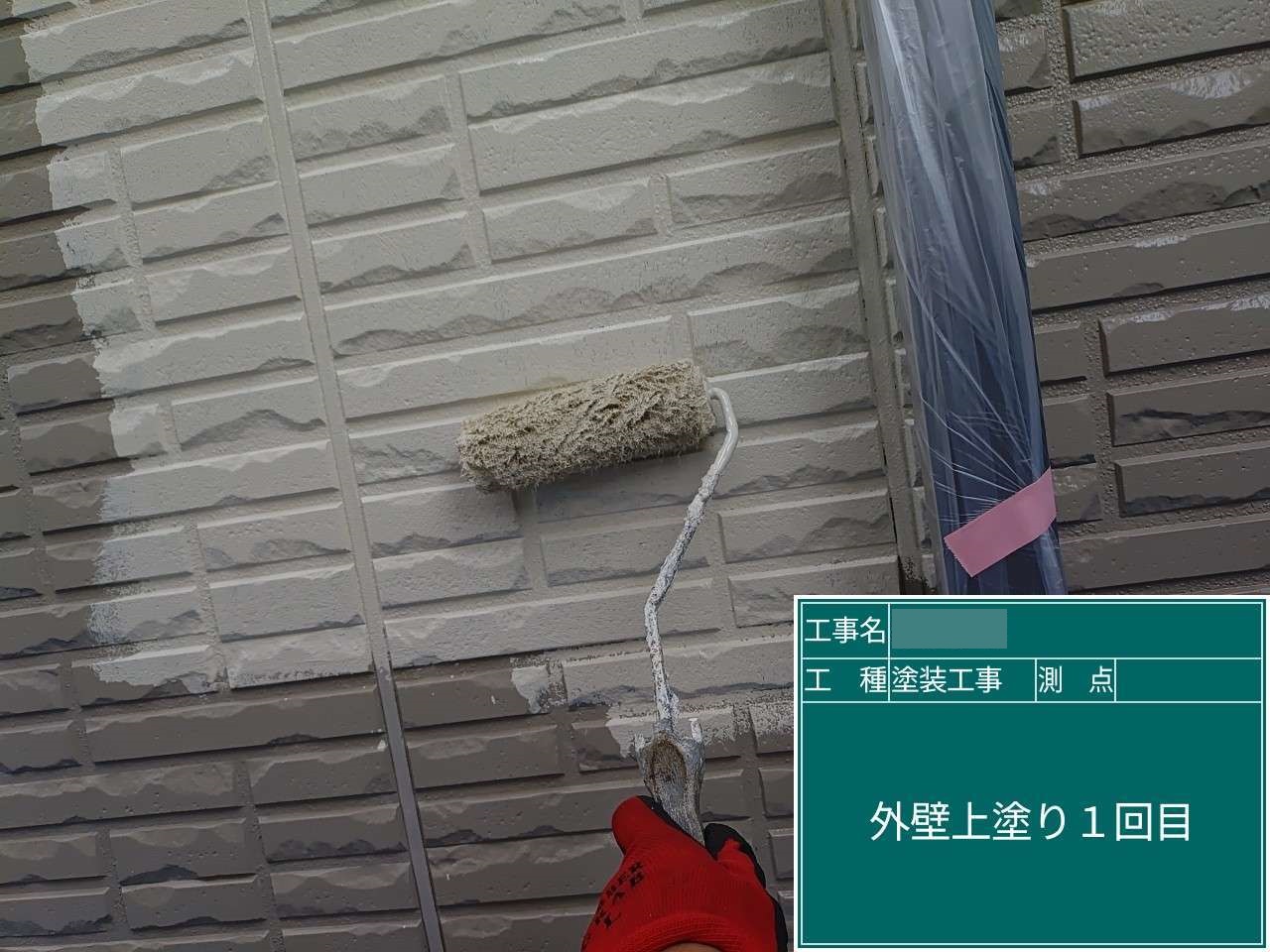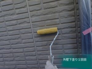 外壁の塗装に入ります。 下塗り一回目にはシーラーを使用します。下地が強化を目的とし、古い塗膜と上塗り塗料の密着性を高める役割があります。