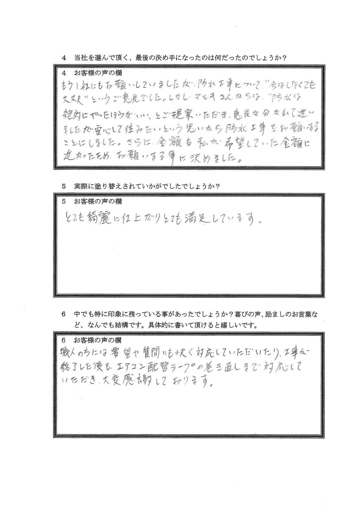 - もう1社にもお願いしていましたが、防水工事について”今はしなくても大丈夫”というご意見でした。しかしマルキさんからは”防水は絶対にやったほうがいい”とご提案いただき、意見が分かれて迷いましたが安心して住みたいという思いから防水工事をお願いすることにしました。さらに金額も私が希望していた金額に近かったため、お願いすることに決めました。
