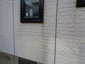 チョーキングがしているかしていないかは、外壁の劣化の目安にもなります。H様邸は指先に粉が付着し、塗膜が劣化していることがわかります。また、遠目に家を見ますと窓の下から汚れのシミが付着していたりしていて、外壁を痛める原因になりかねません。 また、ベランダのサイディングでは割れているところもあり、早急に手入れが必要です。