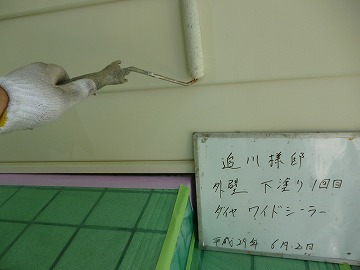 下塗り1回目に浸透性のワイドシーラーを塗布し、下地を強化しました。密着性に優れているため、既存塗膜と新たに塗る塗料との接着剤のような役目もあります。