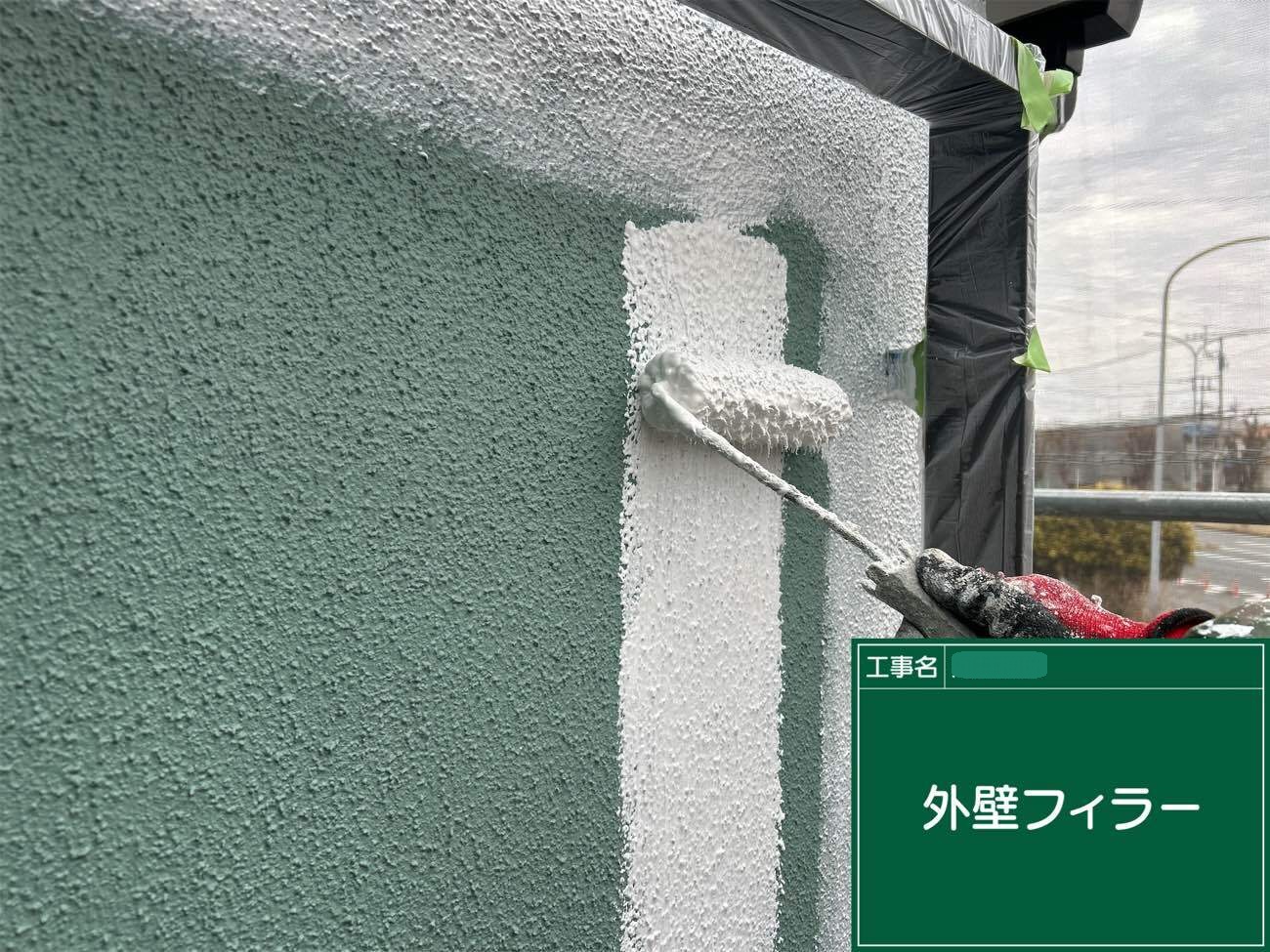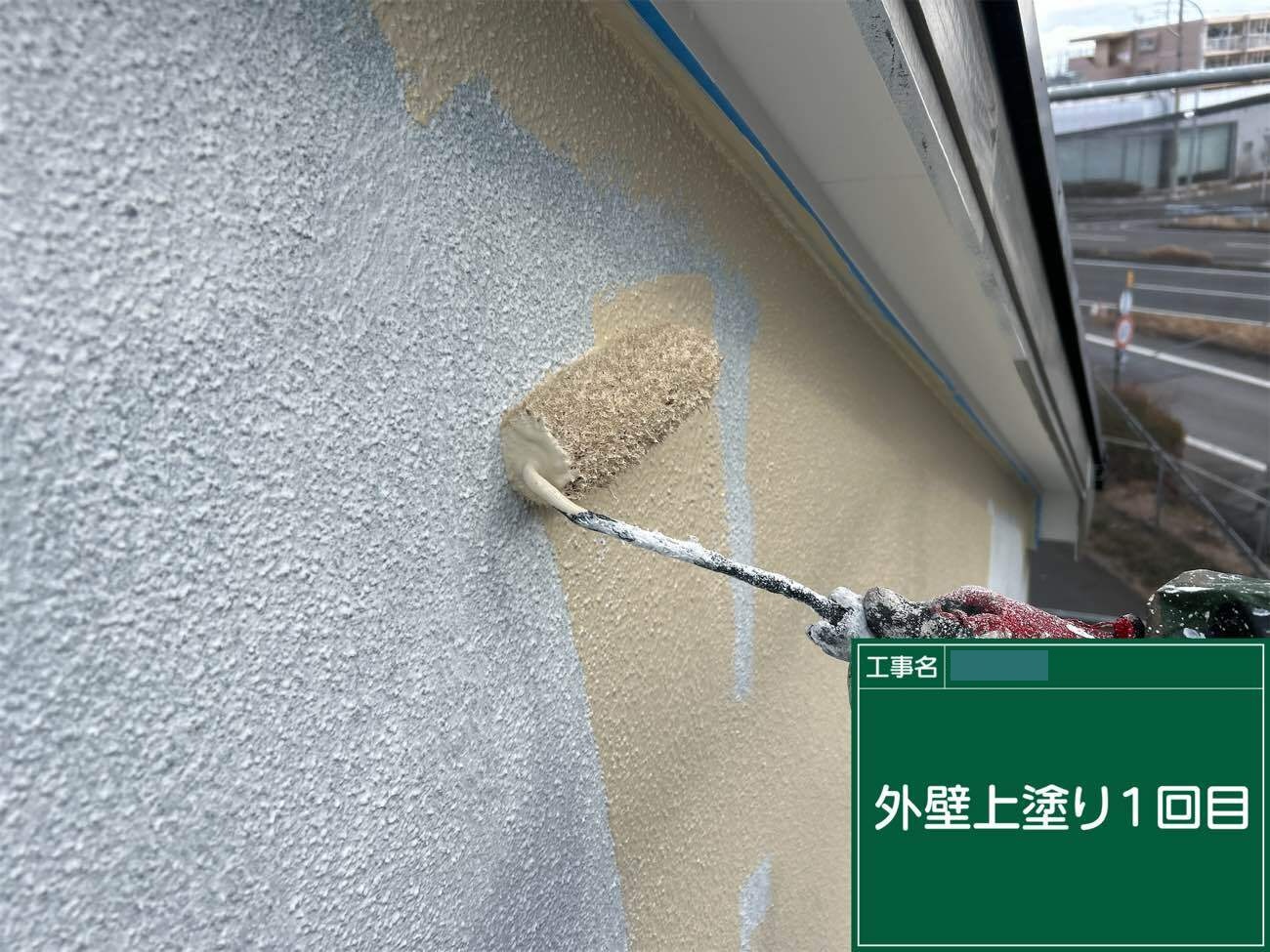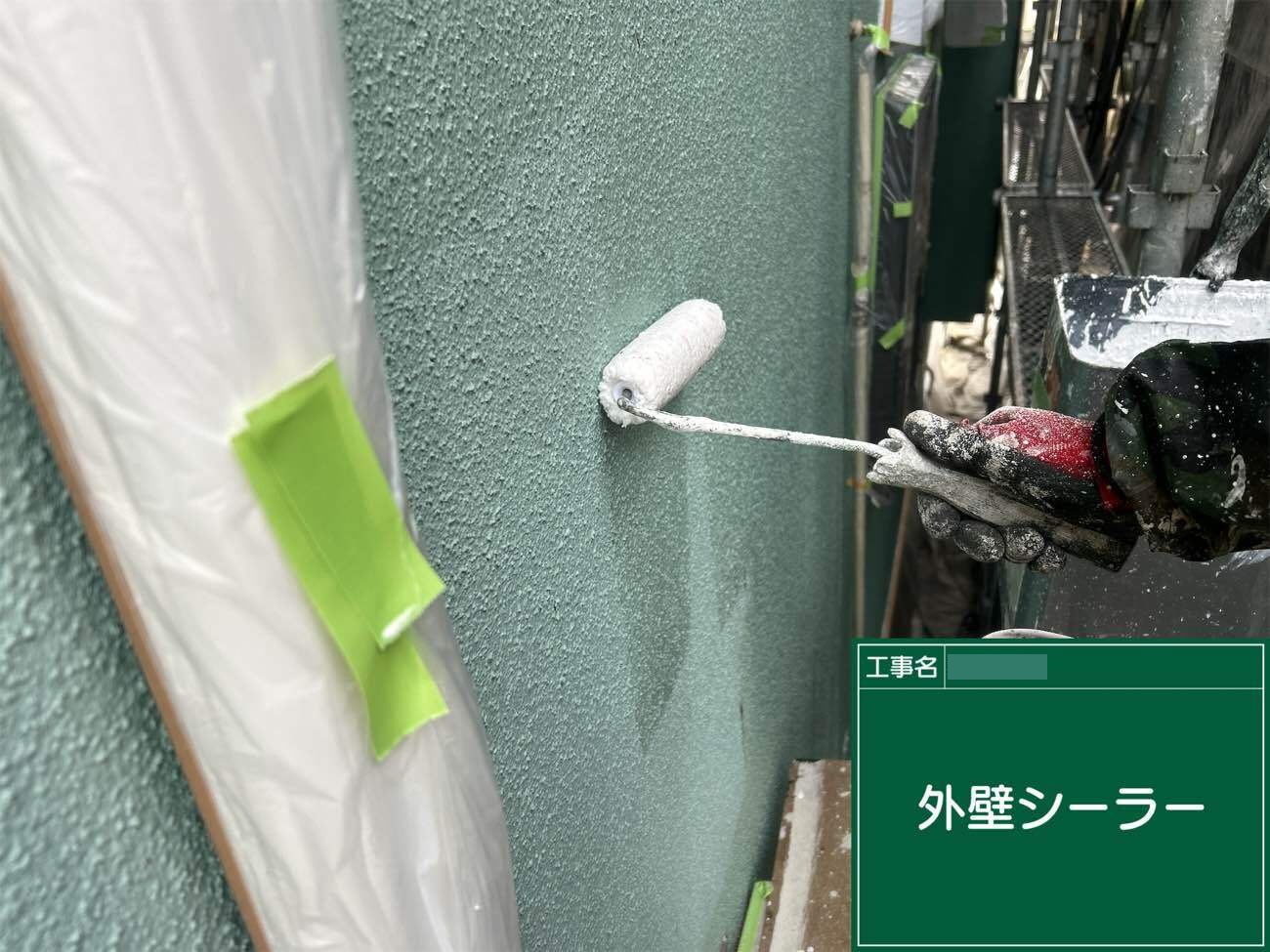 外壁塗装の工程に入ります。下塗り1回目にはシーラーを使用し、下地の補強を行います。既存の塗膜と上塗り塗料の密着性を高めるための重要な工程です。